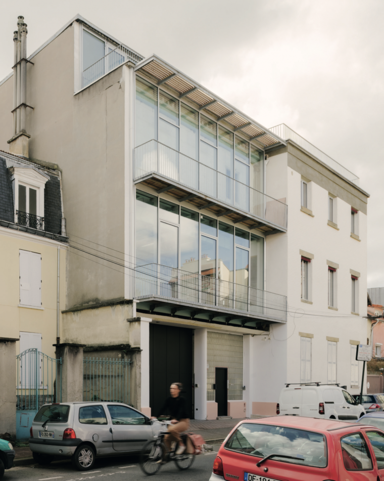 La construction initiale, datant du début du 20ème siècle, est débarrassée de l’enduit afin de retrouver la composition de la façade et la brique d’origine, lui redonnant son identité forte de lieu de production. L’extension des années 50, comprenant le bâtiment pont et la surélévation, est habillée d’un nouveau mur-rideau pour remplacer l’existant amianté. Au-dessus de l’entrée, le projet profite du retrait de cette extension pour installer des balcons en console reprenant l’alignement sur rue. Ces espaces « en plus » offrent une nouvelle qualité aux locaux et un espace extérieur à chaque étage.